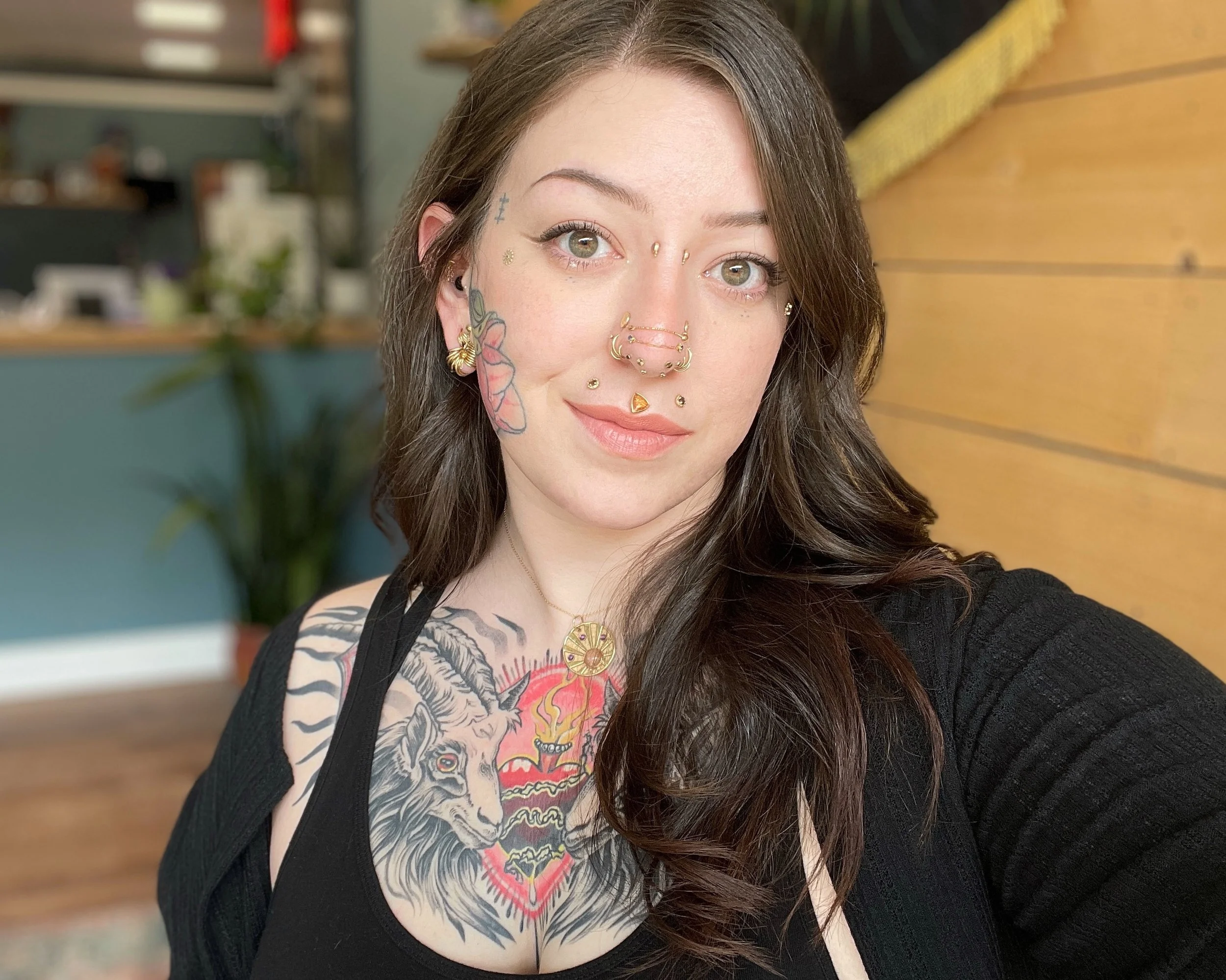 I’m not ~just a piercer~, I’m a mom to a really cool kid, and engaged to a really cool guy. My interests include paleontology, true crime, football, and animals of all kinds (but especially rats!). In my free time, I love snuggling my two cats and spending quality time with my family.